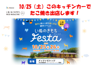 11日オープンしたキッチンカー「車屋がやるたこ焼き屋」が今週土曜日、飯能市にある“ムーミンバレーパーク”に隣接している、メッツァビレッジにて10:00~16:00で「いぬのきもちフェスタ」に出展します!!